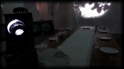 Phantasmagoria, 1945 is the story told by Nazi Propaganda Minister Joseph Goebbels to his six young children while presenting an after-dinner slide show using a magic lantern and glass slides. It’s a children’s ghost story about propaganda and the media, a meditation on the past as a warning to the present. This film was part of a four-channel video installation presented at Schloss Rheydt – the actual castle that Goebbels was given by the town of Mönchengladbach in 1942. And this is the same town where the creator’s father was born and escaped from in 1939. The opening footage was shot at the actual castle.